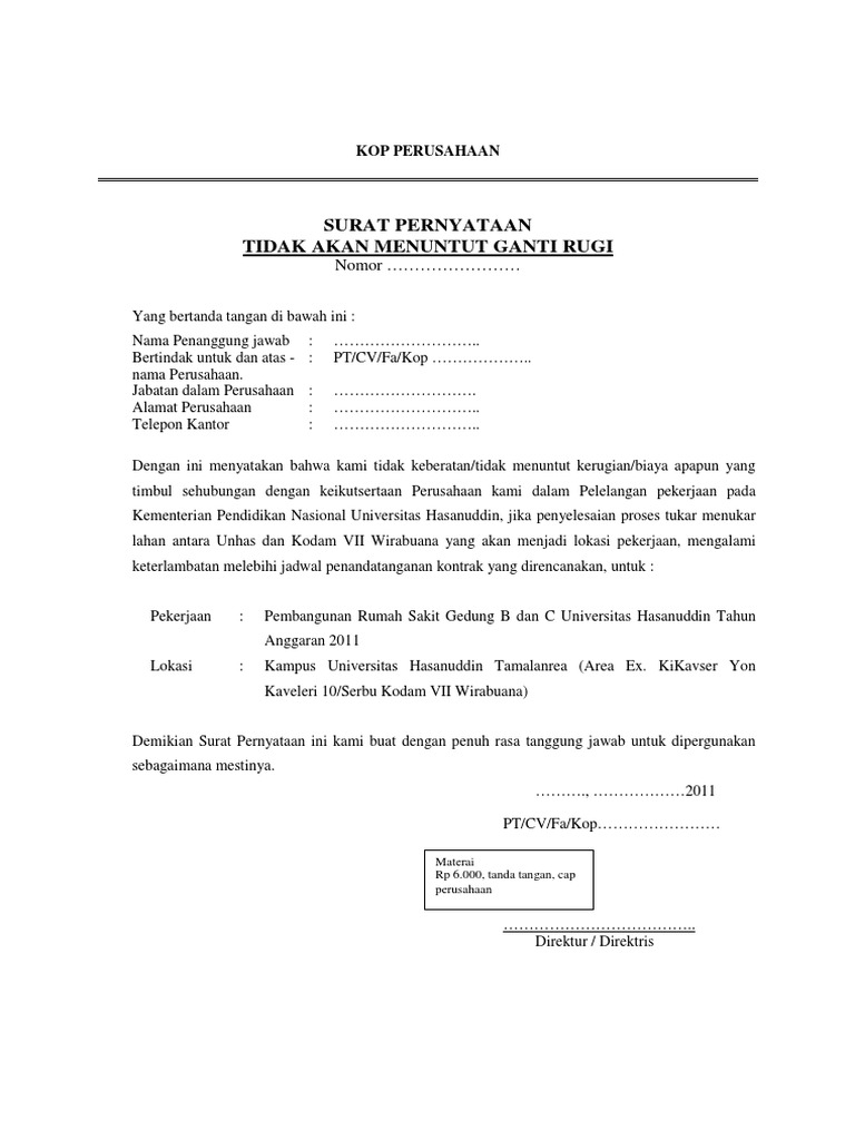 Surat Pernyataan Tidak Akan Menuntut Ganti Rugi Pdf